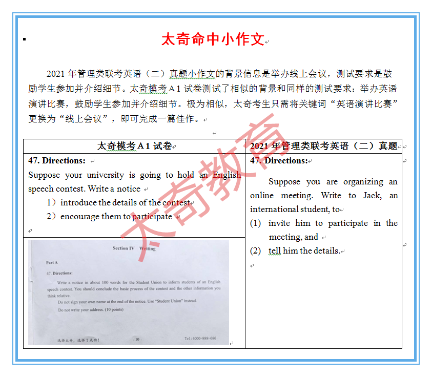 導(dǎo)讀:喜賀太奇教育英語(yǔ)教研組押中英語(yǔ)全部作文附題目押中來源